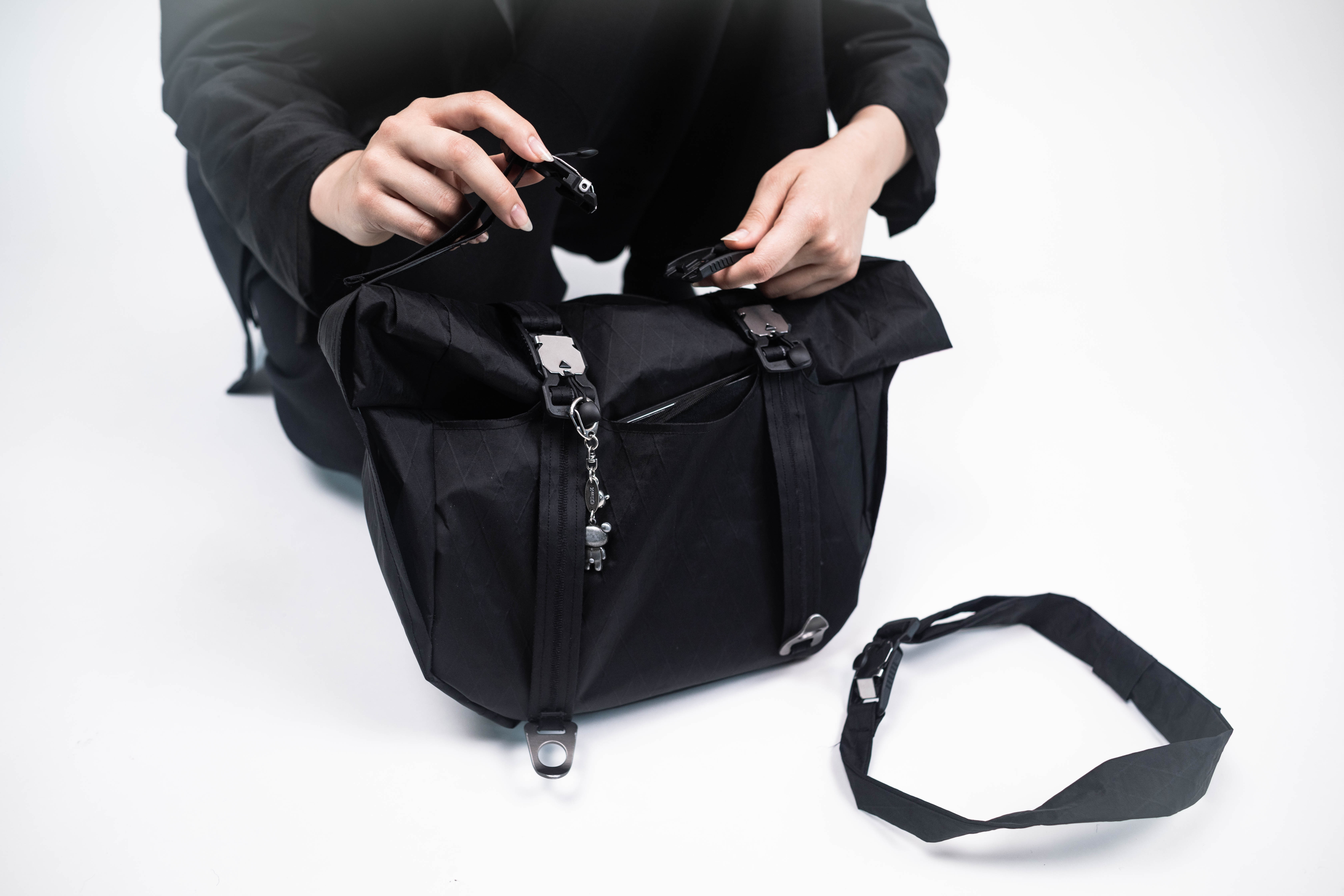 Magnetic buckles for securing roll-top and connections.